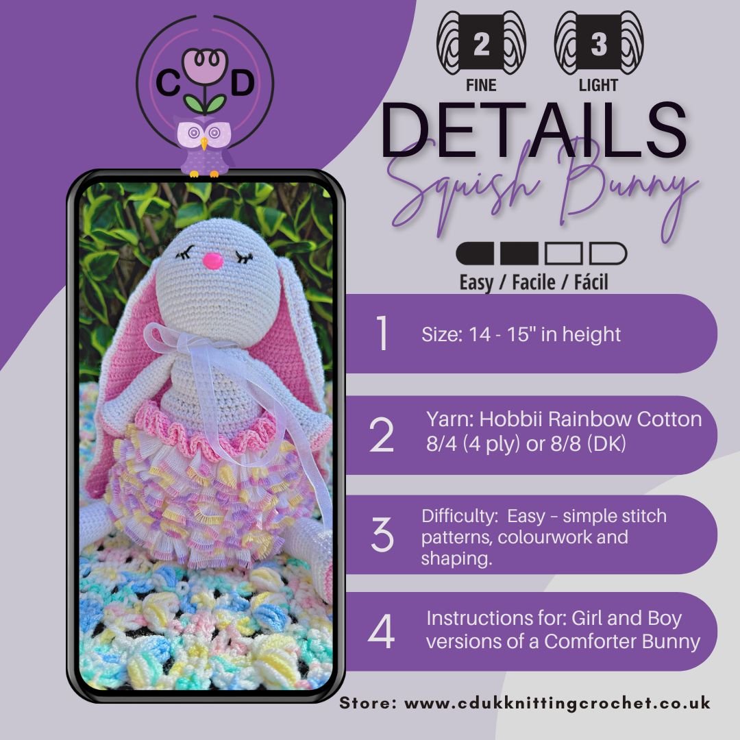 Discover the perfect cuddly companion for your little one with our baby's squishy comforter bunny crochet pattern. Designed with love and care, this adorable bunny is crocheted using soft and breathable 4 ply or DK cotton, ensuring your baby's ultimate comfort and safety. Whether it's naptime or playtime, our squishy bunny crochet pattern is designed to provide endless comfort and joy. Shop now for fun and very cute knit and crochet pattern downloads for your precious bundle of joy.